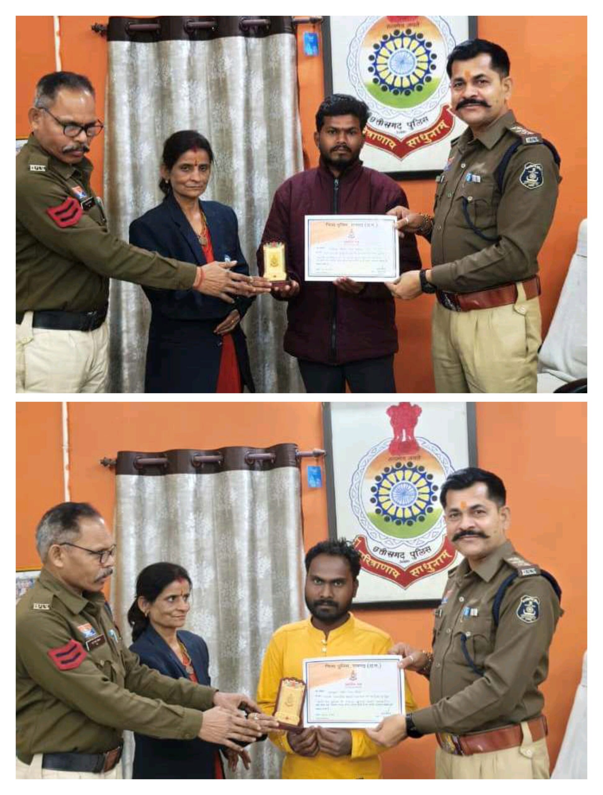 इसी क्रम में ग्राम रिलो निवासी लवकुश महंत एवं ग्राम पुसल्दा निवासी हरिशंकर चौहान को भी प्रशस्ति पत्र देकर उत्साहवर्धन किया गया। ये दोनों युवा क्षेत्र में शांति व्यवस्था बनाए रखने में पुलिसमित्र की तरह सहयोग कर रहे हैं और लगातार पुलिस का सकारात्मक सहयोग कर रहे हैं।