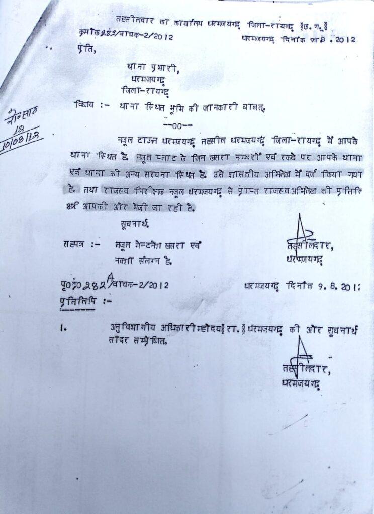 इस बीच, पुराने राजस्व अभिलेख भी विवाद का हिस्सा बन गए हैं। उपलब्ध दस्तावेजों के अनुसार, यह जमीन वर्ष 1929 से थाना परिसर के रूप में दर्ज है और वर्ष 2012 के रिकॉर्ड में भी इसका उपयोग पुलिस विभाग से जुड़ा बताया गया है। ऐसे में भूमि के उपयोग को लेकर सवाल खड़े हो रहे हैं।