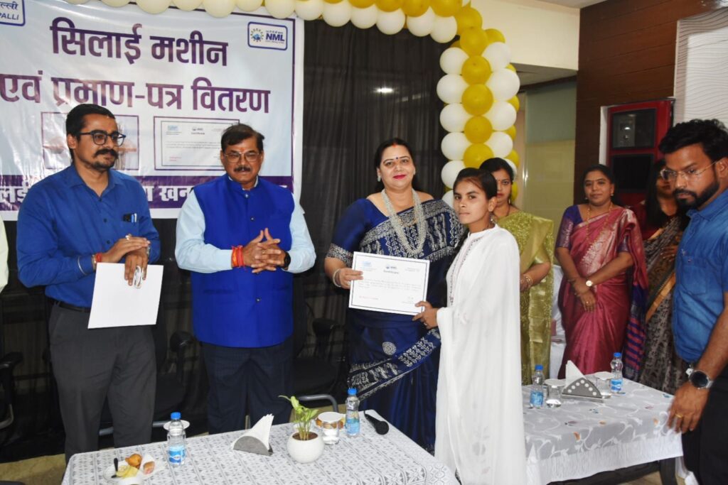 घरघोड़ा | एनएमएल तलईपल्ली कोयला खनन परियोजना द्वारा सामुदायिक विकास पहल के अंतर्गत कौशल प्रमाणन एवं 51 सिलाई मशीन वितरण कार्यक्रम आयोजित किया गया। इस अवसर पर परियोजना प्रभावित क्षेत्र से जुड़े प्रतिभागियों को प्रशिक्षण प्रमाण पत्र के साथ सिलाई मशीनें प्रदान की गईं, जिससे उन्हें स्वरोजगार के अवसर उपलब्ध हो सकें।