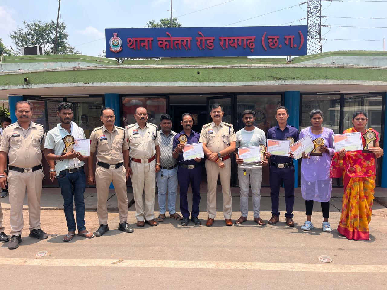*रायगढ़, 06 जून*- पुलिस अधीक्षक श्री दिव्यांग कुमार पटेल के दिशा निर्देशन एवं डीएसपी श्री सुशांतो बनर्जी के मार्गदर्शन में कोतरारोड़ पुलिस द्वारा क्षेत्र के जनसहयोगियों को सम्मानित कर उनका उत्साहवर्धन किया गया। इस अवसर पर थाना प्रभारी निरीक्षक श्री त्रिनाथ त्रिपाठी द्वारा सराहनीय सामाजिक सहयोग देने वाले आंगनबाड़ी सहायिका, मितानिन, कोटवार व पुलिस मित्रों को प्रशस्ति पत्र एवं प्रतीक चिन्ह भेंट कर सम्मानित किया गया।