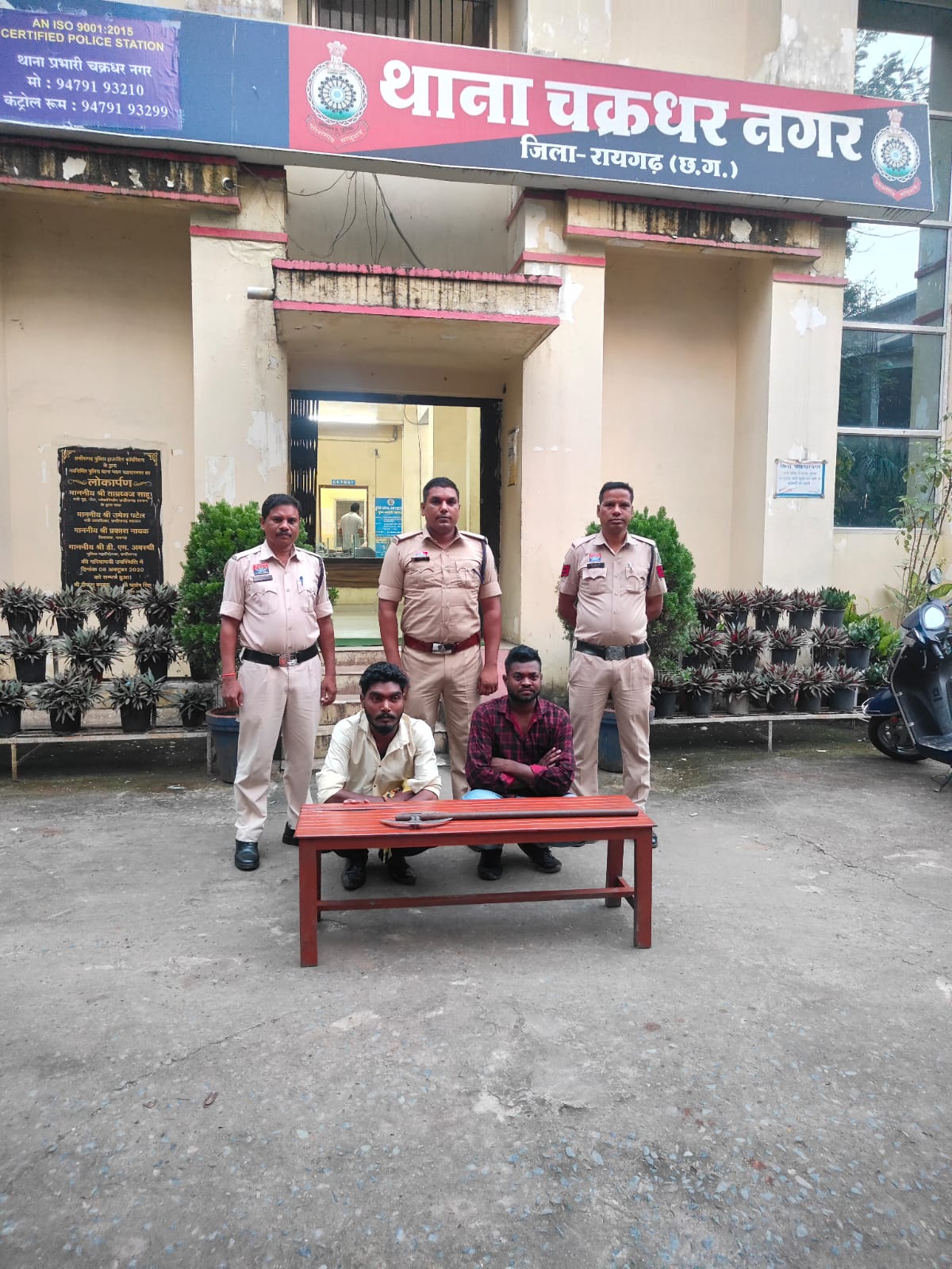 *रायगढ़, 8 अक्टूबर* । चक्रधरनगर पुलिस ने 7 अक्टूबर मंगलवार शाम मानकेश्वरी मंदिर के मेला स्थल (जामगांव) में धारदार हथियार लेकर घूम रहे दो युवकों को पकड़कर जेल भेज दिया है। दोनों आरोपी फरसा लहराते हुए लोगों को भयभीत कर रहे थे, जिन पर पुलिस ने आर्म्स एक्ट की सख्त धाराओं में मामला दर्ज किया है।