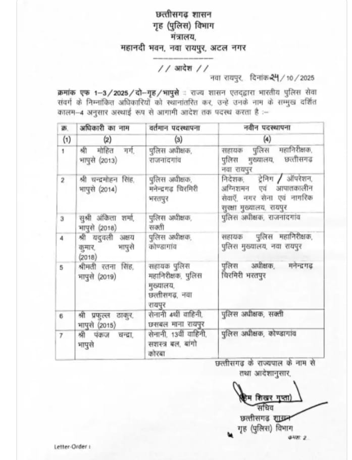 छत्तीसगढ़ सरकार ने शुक्रवार देर शाम पुलिस विभाग में बड़ा प्रशासनिक फेरबदल किया है। गृह विभाग ने 4 जिलों के पुलिस अधीक्षकों (SP) समेत 7 IPS अधिकारियों के ट्रांसफर के आदेश जारी किए हैं।